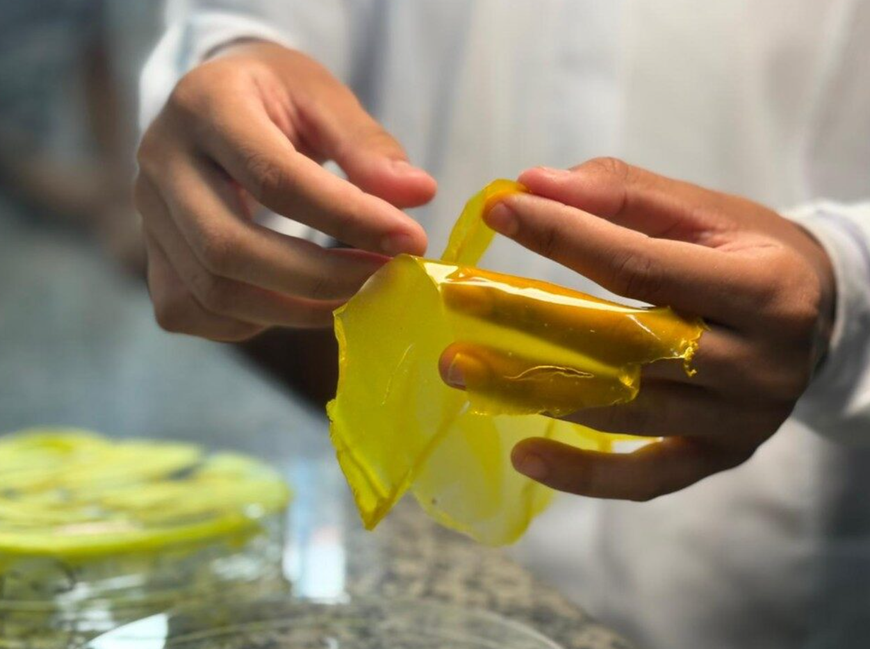 O material foi produzido utilizando amido de mandioca, um polímero natural composto por amilose e amilopectina, cuja estrutura química permite modificações que ampliam resistência e durabilidade.