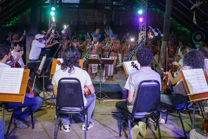 Sob a regência do maestro Hermes Coelho, os músicos executaram obras de Bach e Vivaldi, além de criações brasileiras. Em seguida, a apresentação incluiu cantos e instrumentos conduzidos pelos moradores da aldeia.